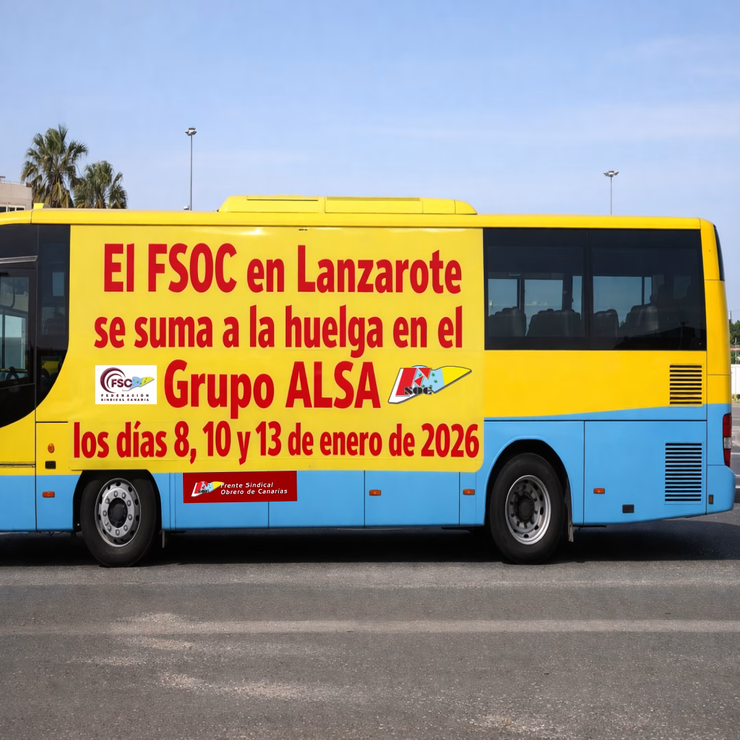 El Frente Sindical Obrero de Canarias (FSOC) en Lanzarote, junto a su Sección Sindical en el Grupo ALSA de transporte discrecional de pasajeros en la provincia de Las Palmas, ha aprobado en Asamblea sumarse a la HUELGA convocada para los días 8, 10 y 13 de enero de 2026.
